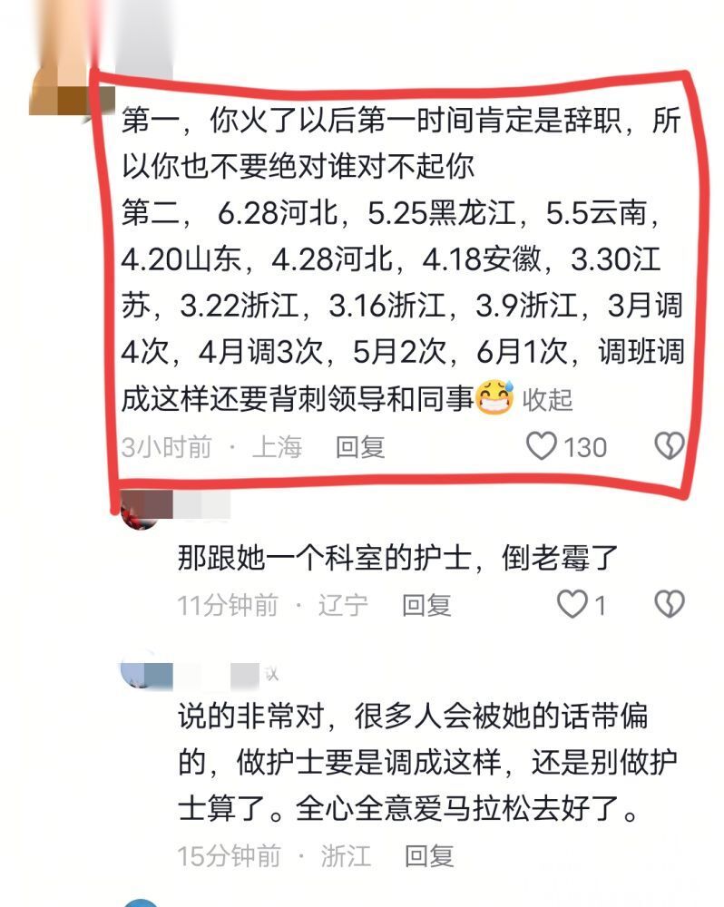 有网友扒出她每月几乎都在异地参赛,河北、黑龙江、云南、山东、安徽、江苏、浙江……“能跑能飞”,就是把休假当“全中国巡演”使了。还有匿名同事和医生接受采访,直言张水华每跑一场马拉松,都要从岗位上“抠”出三天时间,留下的战友只能硬顶夜班连轴转。有人说:“上个月我给她顶了四个大夜班,第二天还得白班,铁人都撑不住。”站在科室的角度,这不是简单一场调班,而是牵一发而动全身。