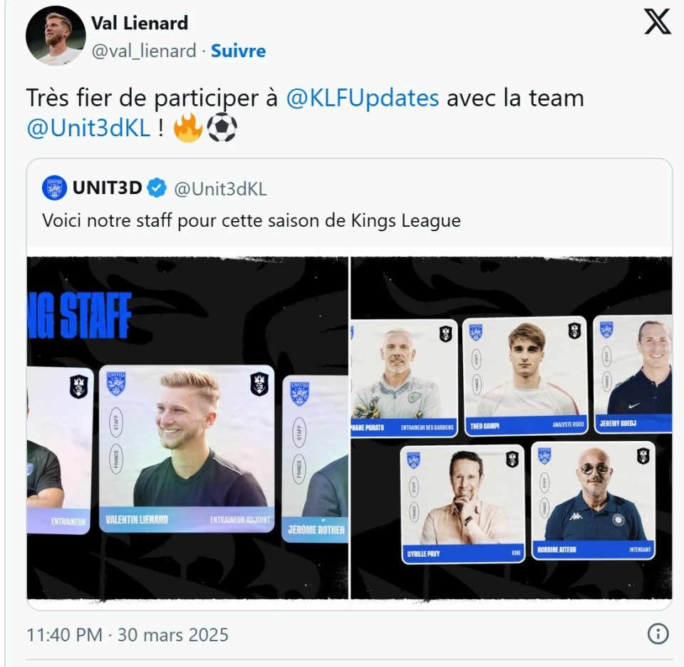 利纳尔在法国网络足球圈早已小有名气,他的视频内容大多围绕“半职业球员的日常”,吸引了大批粉丝追随。今年,他还曾参与风靡欧洲的国王联赛(法国区),以教练身份和前职业球员以及知名主播一起执教Unit3d队。